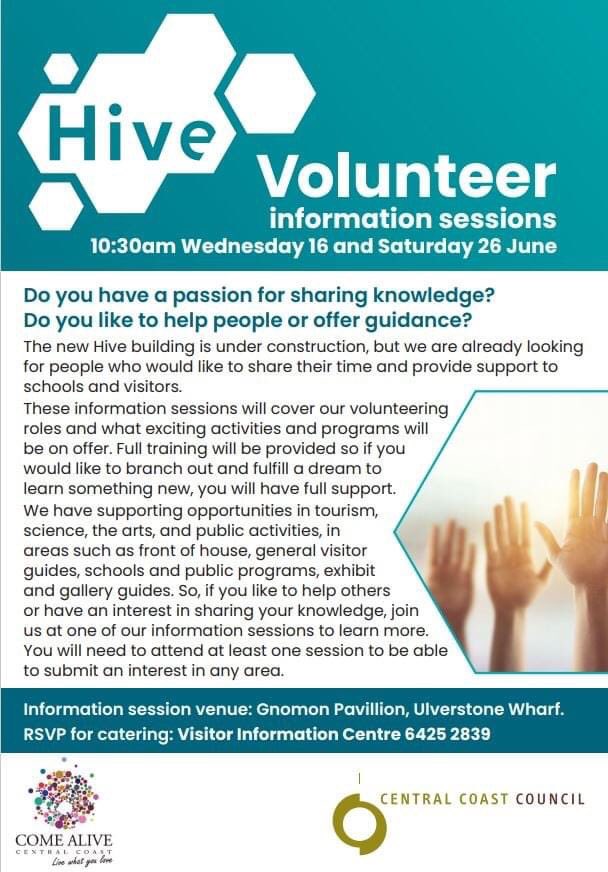 The new Hive building is under construction, but they’are already looking for people who would like to share their time and provide support to schools and visitors. These information sessions will cover our volunteering roles and what exciting activities and programs will be on offer. Full training will be provided so if you would like to branch out and fulfill a dream to learn something new, you will have full support. They have supporting opportunities in tourism, science, the arts, and public activities, in areas such as front of house, general visitor guides, schools and public programs, exhibit and gallery guides. So, if you like to help others or have an interest in sharing your knowledge, join us at one of our information sessions to learn more. You will need to attend at least one session to be able to submit an interest in any area.